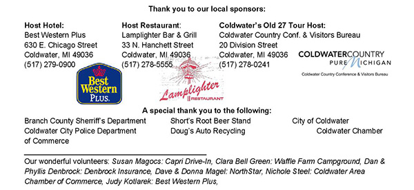 LOCAL INFORMATION: www.ColdwaterCountry.com or download the FREE “Coldwater Country” App Host Hotel:Best Western Plus Hotel Coldwater630 E Chicago St (US12) Coldwater, MI 49036 Ph. 517-279-0900 Room Rates 69.99+tax single bed Almost next to Big Boy |