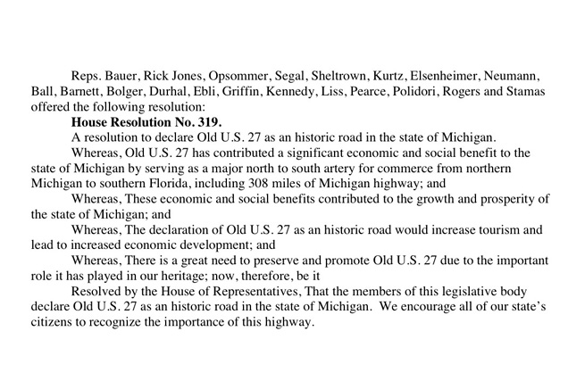 I am proud to have sponsored a House Resolution to declare Old US-27 as a historic road in the State of Michigan in recognition of the historic econom ic and social benefits to the State of Michigan. All states along Old US-27 are being asked to declare the route as a historic road and the House appr oved a resolution to make such a designation in Michigan. For many years, O ld US-27 was the major north/south road connecting Michigan to Florida, running from Cheboygan to Miami. Old US-27 travels through many towns, villages, and cities in our state and promotion of the nearly 308 mile route can result in increased traffic and tourism, much like what was occurred with Route 66. This issue was brought to me by Michigan citizen Craig Parrish who deserves special recognition for his relentless support of and advocacy for this designation.