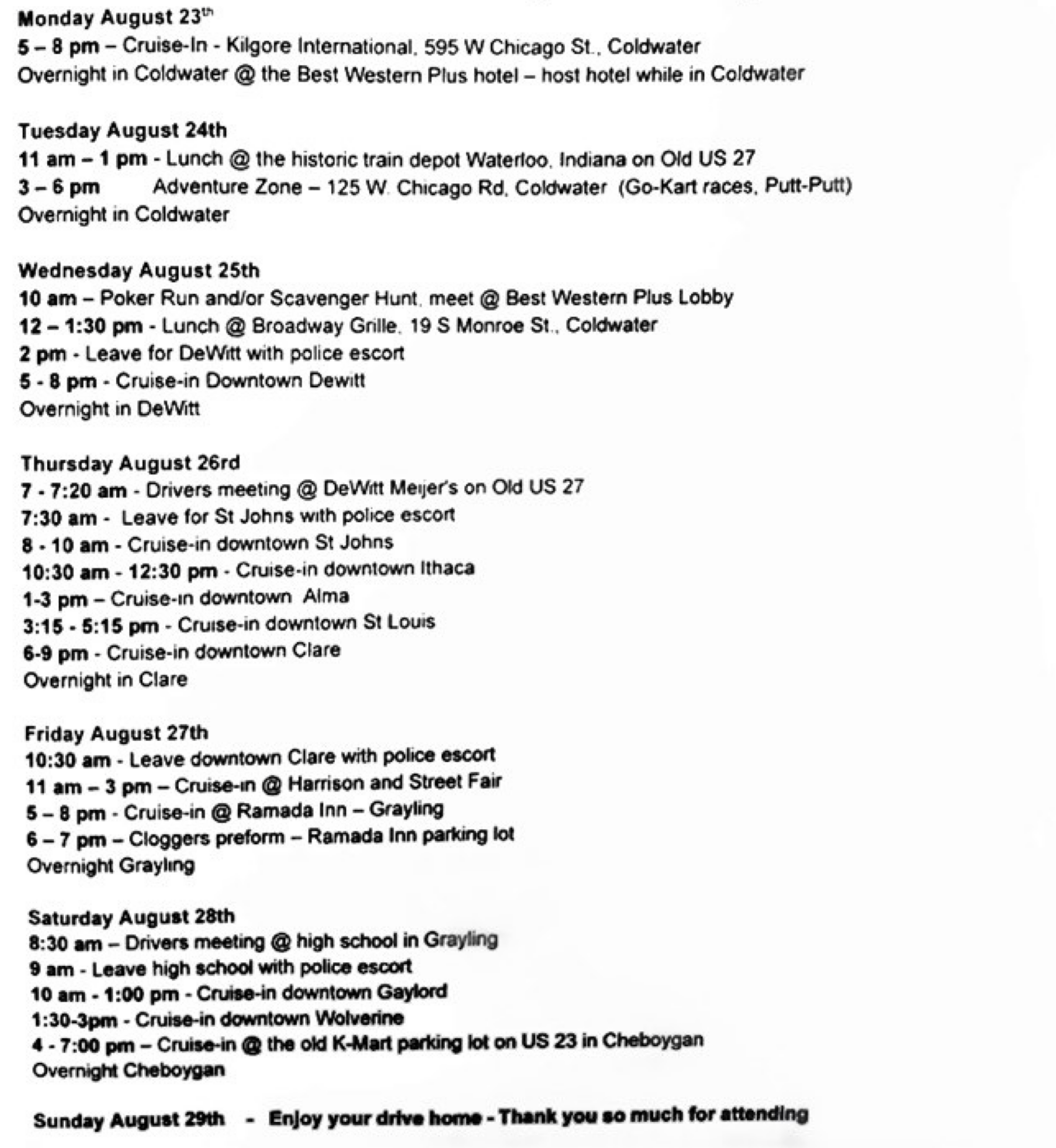 2020 MICHIGAN OLD U.S. 27 TOUR ITINERARY